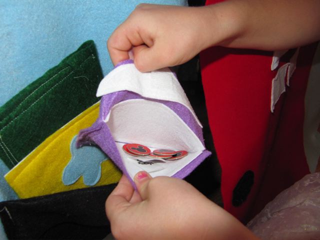 I saw this idea a while ago, but just got around to making one. It's a little slip cover for a card table- so it can be folded up and put away. It's made out of felt, so it is pretty durable, and the best part is that it didn't require much to put it together. I didn't measure very well, I didn't hem anything, and overall, it went together pretty quickly (total of about 4 hours and maybe $30) I still want to make some other additions like flowers for the window baskets and maybe some little shape matching games for the back, but I'm happy with it.